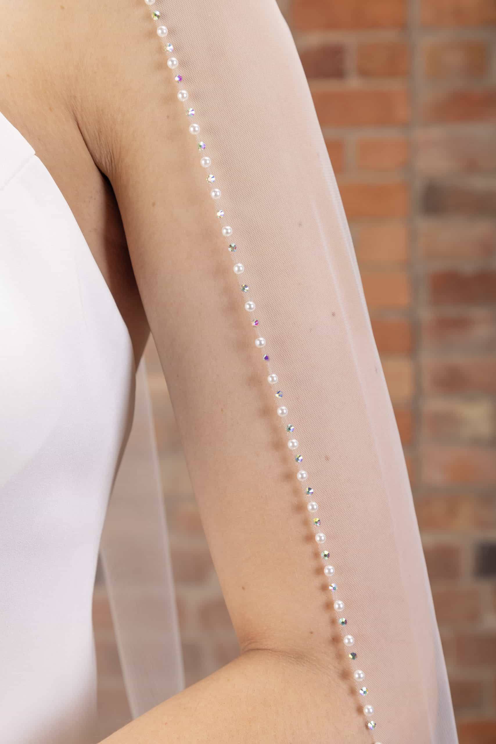 We love this delicate pearl and crystal edged veil. Its a simple elegant veil that has a touch of sparkle that’s perfect for so many wedding dress styles. All Perfect Bridal veils have a metal comb for extra support.