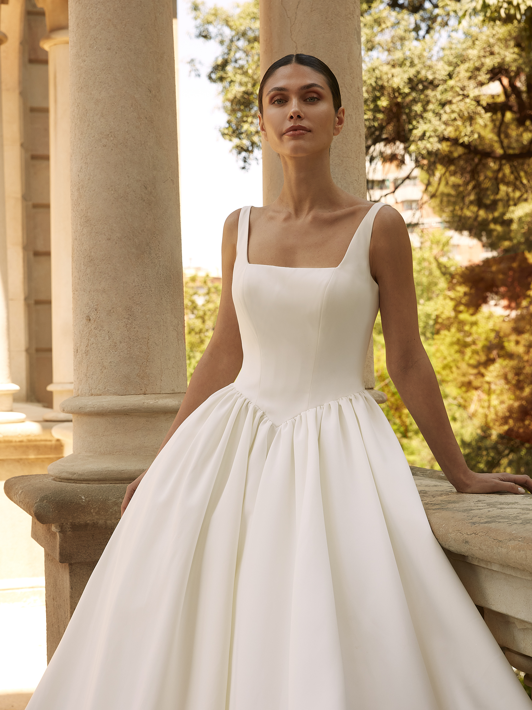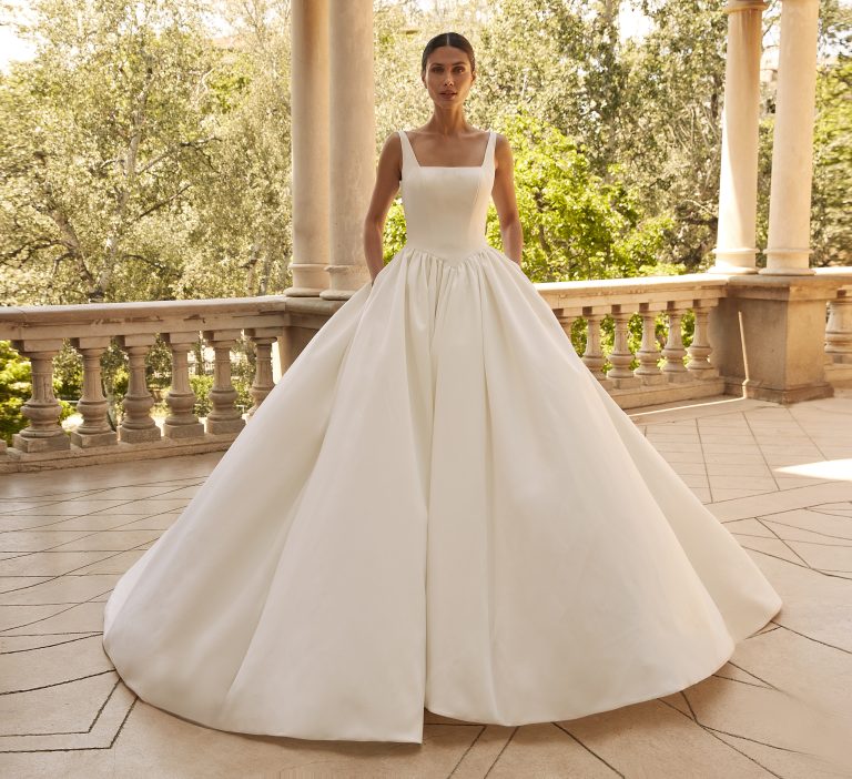 The elegant square neckline offers a refined, structured bodice that flows into a breath-taking full satin skirt.