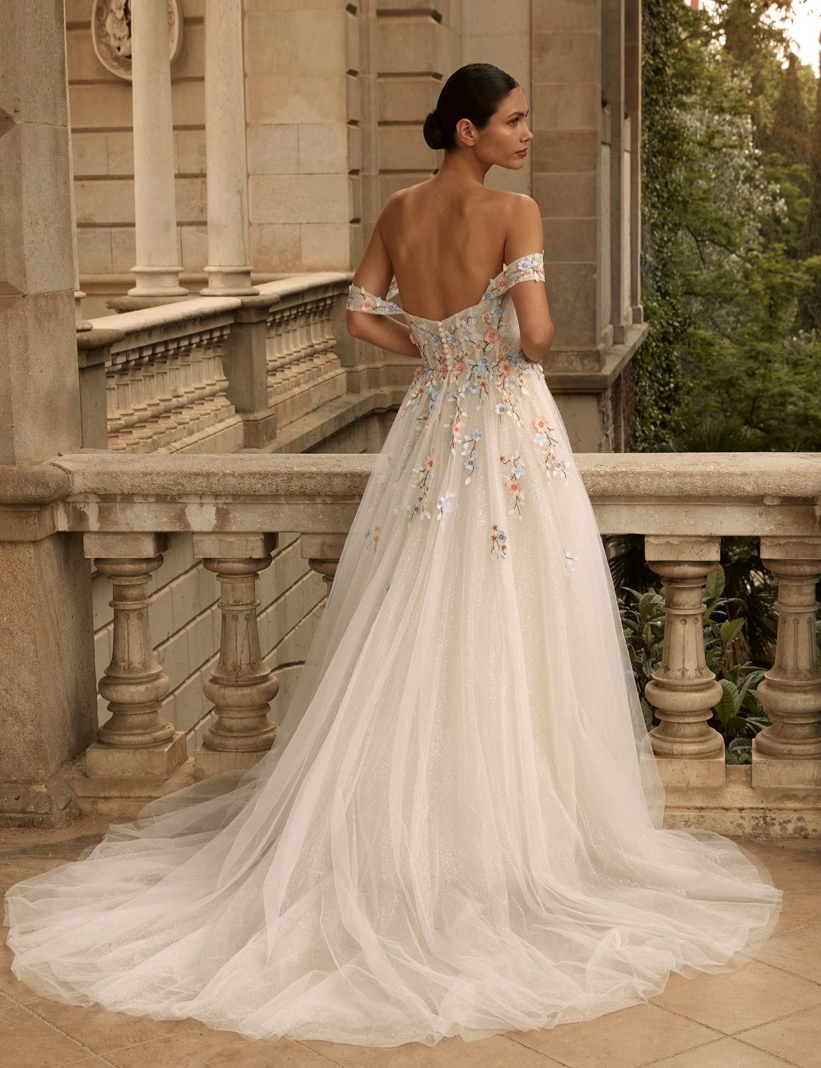 Asta is a stunning off the shoulder floral wedding dress with delicate colourful embroidery. It’s perfect for a romantic bridal vibe.